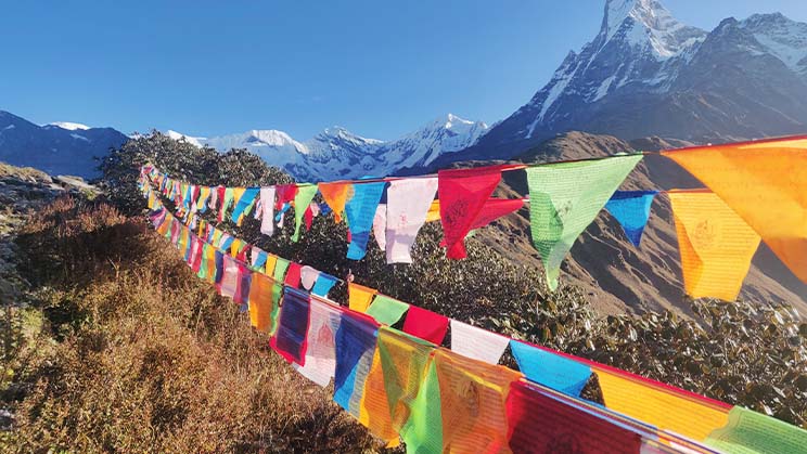 Además de bonitas, las banderas de oración encierran un profundo simbolismo. Sus colores representan a los cinco Buddhas primordiales, y sus grabados muestran mantras y dibujos auspiciosos.