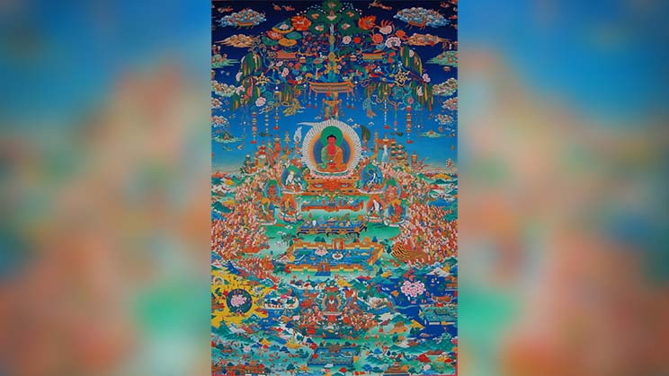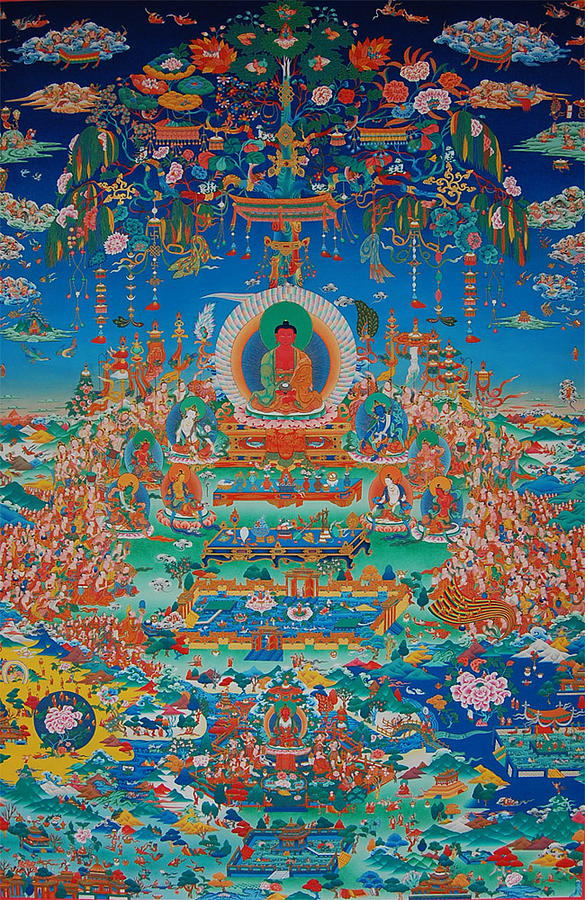 Entonces se sentó erguido, clavó su mirada en la pintura y recitó oraciones para renacer allí. Acto seguido, recitó 108 mantras de Avalokiteshvara. Se detuvo. Colocó sus manos en el mudra de la meditación sobre el regazo y entró en una absorción. Poco después su cuerpo se estremeció al compás de unos ligeros sonidos.