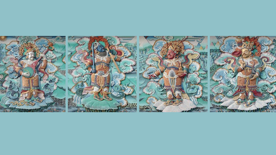 En casi todos los monasterios tibetanos y chinos, las imágenes de los Cuatro Grandes Reyes aparecen en la entrada, ya que cumplen un rol importante en defender el Dharma.