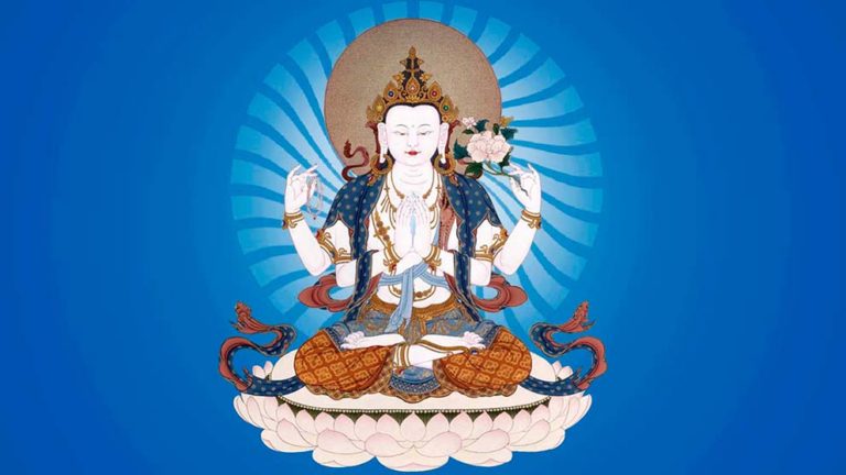Avalokiteshvara ―Chenrezig en tibetano― es el Buddha de la Compasión. Etimológicamente significa “el señor que mira hacia abajo, que aprecia y toma en cuenta a todos los seres”. También conocido como Padma Pami, el que sostiene la flor de loto.