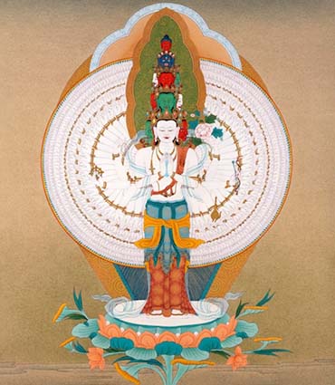 Avalokiteshvara de Mil Brazos: la forma más elaborada que personifica la compasión ilimitada. Tiene once cabezas y mil brazos con los que desarrolla sus inconcebibles actividades iluminadas.