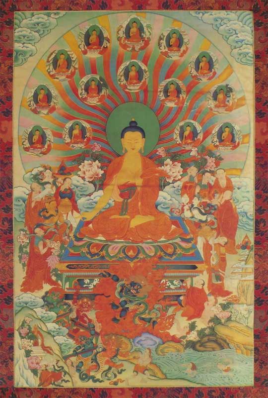 ▪  El ombligo del Buddha emanó dos rayos de luz de quince metros. Al final de cada uno había un loto y, sobre cada loto, un buddha. De sus ombligos surgieron otros dos rayos de luz con sendos lotos y buddhas encima, y así hasta que el espacio se llenó de buddhas.
