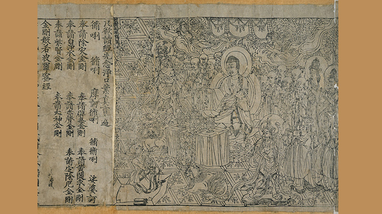 ―Frontispicio del Sutra de la perfección de la sabiduría del vajra cortador, Cuevas de Mogao, Dunhuang (China), 868 e. c., considerado como el libro impreso completo más antiguo con datación que se conserva en el mundo. British Library, Londres (Reino Unido). Public domain, via Wikimedia Commons―