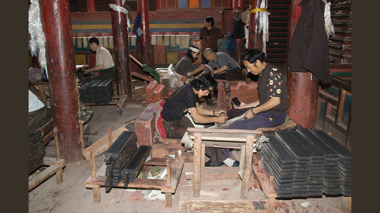 ―Personal trabajando en la impresión del Kangyur en la Sala de Tipografía del monasterio de Degé, Sichuan (China). Imagen de escritor italiano Mario Biondi,GNU Free Documentation License 1.2, via Wikimedia Commons―