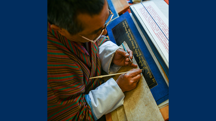 ―Calígrafo butanés escribiendo el Kangyur con tinta de oro, Thimphu (Bután). Imagen de Cristopher John Fynn, CC BY-SA 4.0, via Wikimedia Commons―