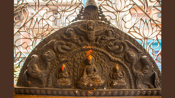 ―Pórtico (torana) del templo Newar de Seto Machhindranath, Katmandú central, 1502 e. c., en la que se representan las Tres Joyas según la interpretación Newar: Buddha Aksobhya (centro), Prajñaparamita (Dharma) (izda.), Avalokiteshvara (Sangha) (dcha.). Imagen de Bijaya2043, CC BY-SA 4.0, via Wikimedia Commons―