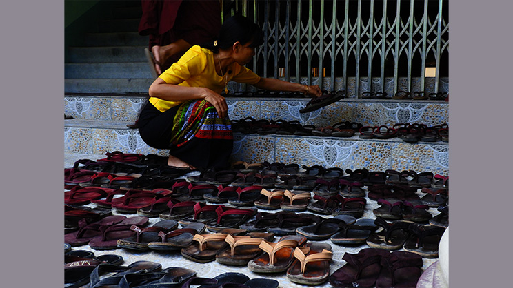 ―Devota seglar coloca las sandalias de los monjes mientras comen en el monasterio, de modo que puedan calzarlas con mayor facilidad a la salida. Se afirma que cualquier acto virtuoso ―por insignificante que sea― produce un gran mérito, en especial si se realiza en beneficio de la comunidad monástica. Myanmar, fotografía tomada el 19 de agosto de 2019. Imagen de MarenHumburg, CC BY-SA 4.0 , via Wikimedia Commons―