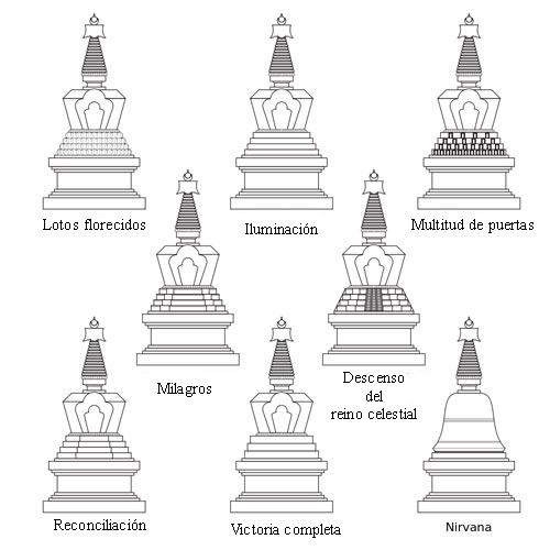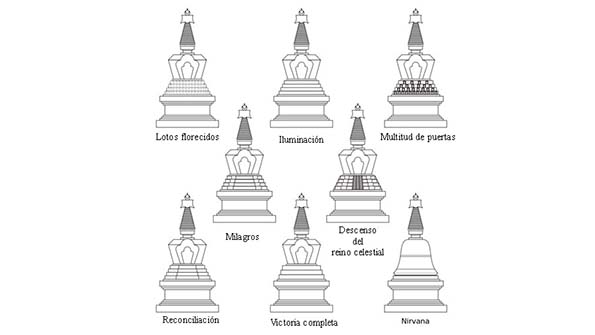—Las 8 estupas del budismo tibetano (Fuente: Handbook of Tibetan Symbols and Motifs, R. Beer)—