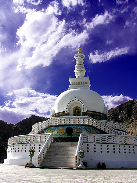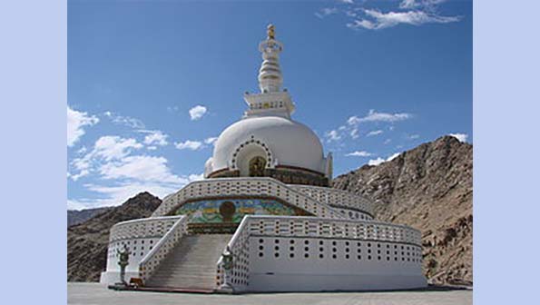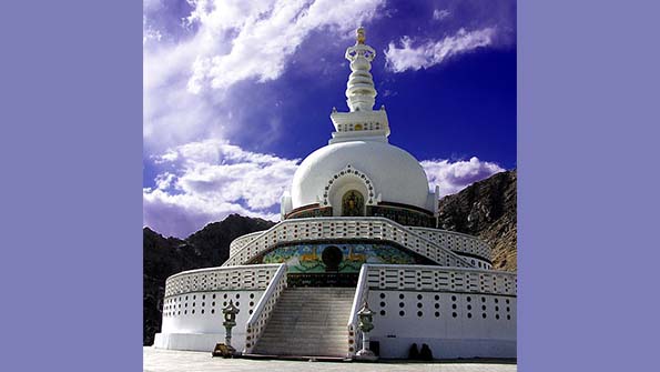 La estupa Shanti es una pagoda de la paz construida por budistas japoneses y ladakhis, e inaugurada en 1991 por S. S. el Dalai Lama, quien colocó en su base reliquias del Buddha Shakyamuni. Hoy es una de las mayores atracciones turísticas y espirituales de la zona, además de un monumento a los 2.500 años de historia del budismo.