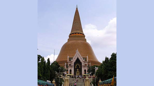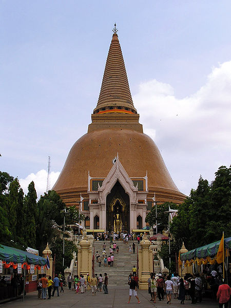 La estupa de Phra Pathommachedi, de 120 metros de altura y 235 de diámetro, es la más alta de Tailandia, y una de las más antiguas del mundo. Su origen se remonta a los monjes que envió el emperador Ashoka a Tailandia para expandir el budismo. Estos levantaron la estupa en el siglo II AEC, pero su forma actual data de finales del XIX, cuando fue completada gracias al patrocinio de la monarquía tailandesa.