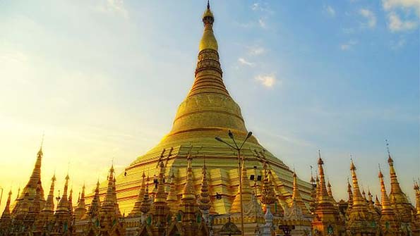 La estupa Shwedagon, con sus 99 metros de altura y bañada de oro, es la estupa más sagrada de Myanmar. Se cree que su interior guarda reliquias tanto del Buddha Shakyamuni como de los cuatro buddhas que le precedieron, así como que la construcción empezó al poco del fallecimiento de aquel. Sea como fuere, alcanzó su altura actual tras más de 9 siglos de obras —del siglo VI al XV—, y hoy es uno de los enclaves religiosos más importantes del país.