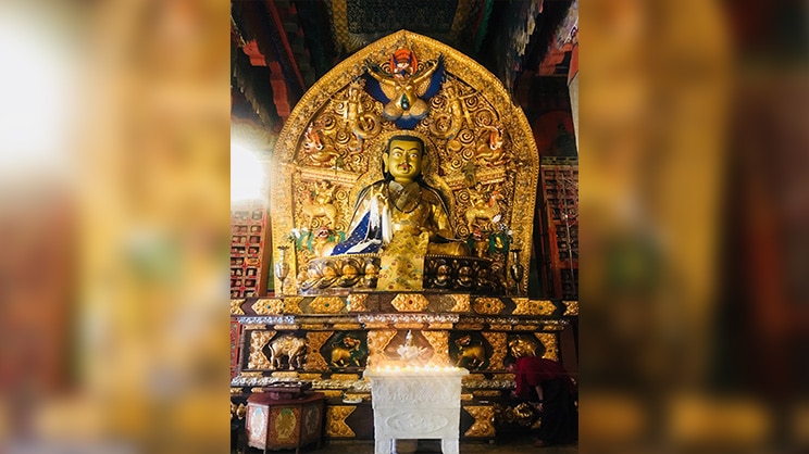 Cuando el Abad Shantarakshita llegó al Tíbet con el propósito de erigir el primer monasterio dedicado a la difusión de las enseñanzas, se encontró con serias dificultades en la construcción. Ante estos obstáculos, sugirió al rey Trisong Detsen que invitara a Gurú Padmasambhava. Una vez llegado Padmasambhava, logró convertir a las fuerzas hostiles de las deidades locales en protectoras del Dharma, permitiendo finalmente la edificación del primer monasterio budista del Tíbet, Samye.