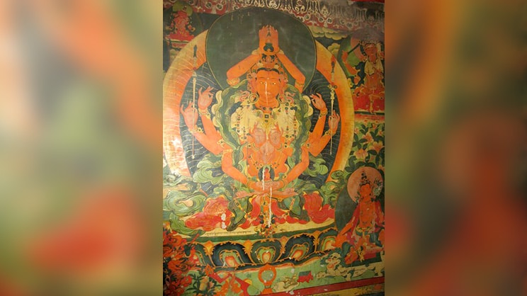 Mañyushri, el Buddha de la Sabiduría. Esta obra proviene del Templo Mañyushri Lhakhang en Sakya, Tíbet, ubicado en el segundo piso del edificio Drolma Lhakhang, conocido por sus murales que representan numerosas manifestaciones de Mañyushri. Fuente: Himalayan Art.