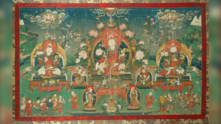Los Tres Reyes del Dharma de Tíbet: Songtsen Gampo (izda.) Trisong Detsen (centro) y Rey Ralpachen (dcha). De la colección del Museo Tibet House, Nueva Delhi. Fuente: Himalayan Art.