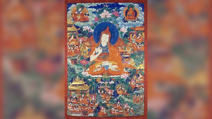 Shantarakshita. Esta pintura del siglo XIX representa episodios biográficos de la vida de este monje budista, destacando su viaje a Tíbet, donde fue fundamental en el establecimiento del budismo. Fuente: Rubin Museum of Art, Public domain, via Wikimedia Commons.