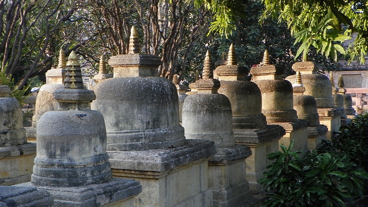 ―Hilera de estupas en el Templo de la Mahabodhi, Bodhgaya, Bihar (India). Foto de Juggadery, CC BY-SA 2.0, via Wikimedia Commons―