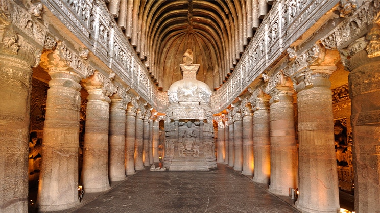 ―“Residencia del Relicario” (Chaitya Griha) utilizada como sala de recitaciones y actos devocionales. Cueva nº 26, Cuevas de Ajanta, s. V e. c., Maharashtra (India). Foto de Dey.sandip, CC BY-SA 3.0, via Wikimedia Commons―