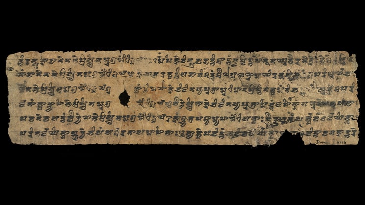 ―Folio de un manuscrito del Sutra del loto blanco del verdadero Dharma (Saddharmapundarika Sutra) en sánscrito y en escritura brahmi, tinta sobre papel, c. s. VI e. c., hallado en Turquestán del sur. Public domain, via Wikimedia Commons―