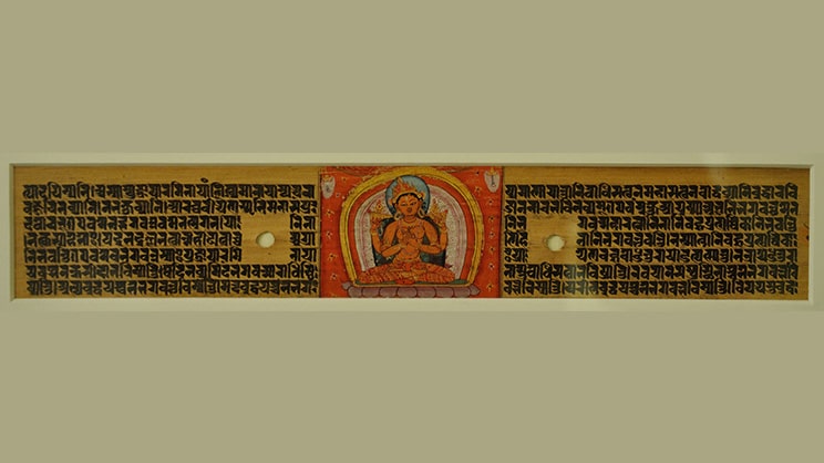 ―Folio de un Sutra de la Prajñaparamita con su imagen en el centro, en sánscrito y escritura devanagari, tinta sobre hoja de palma, c. s. XIII e c. Barendra Bhumi, National Museum, Nueva Delhi (India). Foto de Biswarup Ganguly, CC BY 3.0, via Wikimedia Commons―