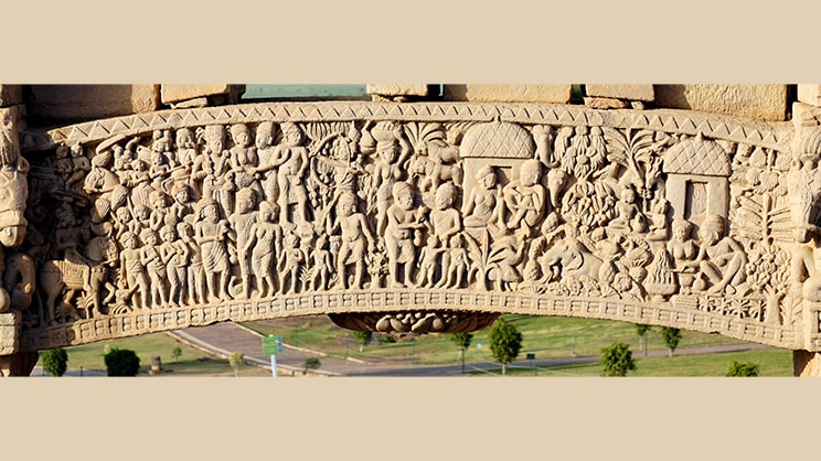 ―Bajorrelieve con la representación del Vessantara Jataka, estupa principal de Sanchi, s. III a. e. c., Vidisha (India). En dicho Jataka se relatan los actos de generosidad suprema llevados a cabo por el Buddha como Bodhisattva en la forma del príncipe Vessantara. Foto de Dharma from Sadao, Thailand, CC BY 2.0, via Wikimedia Commons―
