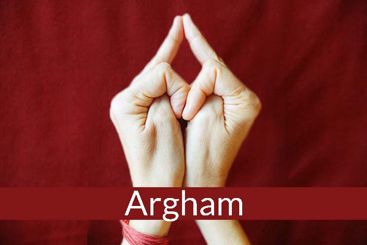 Al igual que el mudra argham, este también representa un chorro de agua pura y cristalina saliendo de un elegante cántaro repleto de agua.