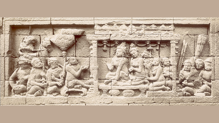 —El bodhisattva Sudhana imparte el Dharma a la diosa kinnari Manohara, escena del Sudhanakumara-avadana perteneciente al Divyavadana, bajorrelieve del templo majayana de Borobudur, s. IX e. c., Java Central (Indonesia). Foto de AnonymousUnknown author, CC BY 4.0