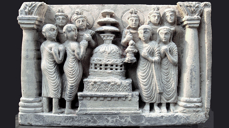 —Monjes (izda.) y devotos seglares (dcha.) indo-griegos circunvalando una estupa, acompañados de bodhisattvas superiores (fondo); arte indo-helénico de Gandhara, s. II e. c., colección particular. Foto de No machine-readable author provided. World Imaging assumed (based on copyright claims), CC BY-SA 3.0, via Wikimedia Commons—