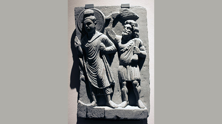 —El Buddha Shakyamuni escoltado por el Bodhisattva Vajrapani (dcha.), que porta el espantamoscas (chamara) (mano dcha.) y el cetro-rayo (vajra) (mano izda.), arte indo-helénico de Gandhara, s. I e. c., relieve de esquisto,  Museum für Asiatische Kunst, Berlin (Alemania). Foto de Antonio Amato, CC BY-SA 4.0, via Wikimedia Commons—
