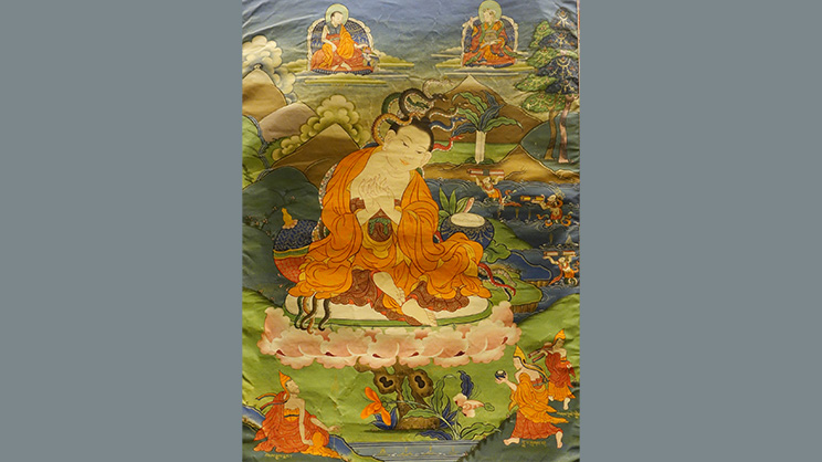 El bodhisattva Nagaryuna recibe los sutras majayana de tres deidades nagas (dcha.); Tíbet, 1644-1911, lienzo pintado (thangka), Sichuan Provincial Museum, Chengdu (China). Foto de Daderot, CC0 1.0 UNIVERSAL, via Wikimedia Common