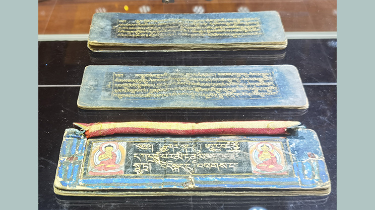 —Manuscrito del Sutra de la perfección de la sabiduría del vajra cortador, Tíbet, s. XV, tinta de oro, colección particular. Foto de User: CatOnMars, CC BY-SA 4.0, via Wikimedia Commons—