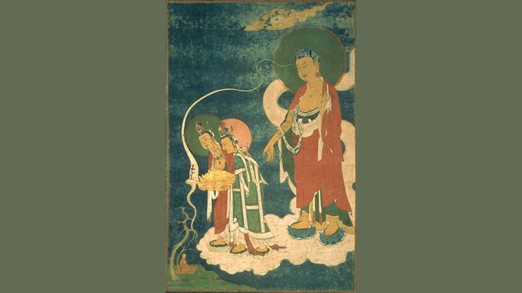 El devoto sentado en meditación (izda. abajo) asciende hasta fundirse con el Buddha Amitabha por su entrecejo; estado Tangut de Xi-Xia, s. XIII e. c., lienzo pintado, hallado en Khara Khoto (China), The State Hermitage Museum (Rusia). Foto de Unknown Author, Public domain, via Wikimedia Commons