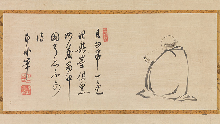 —“Arhat leyendo un sutra a la luz de la luna”, obra del monje chino Jifei Ruyi de la escuela Zen Obaku, s. XVII, período Edo (Japón), rollo para colgar, tinta sobre papel. El poema de la izda. dice: “Luna y blanco papel, un solo color. Pupila del ojo y tinta, negras son. Mora en el círculo el maravilloso significado: más allá de todo entendimiento”. Foto de Metropolitan Museum of Art, New York (EE. UU.), Open Access / CC0 1.0 UNIVERSAL, via Wikimedia Commons—