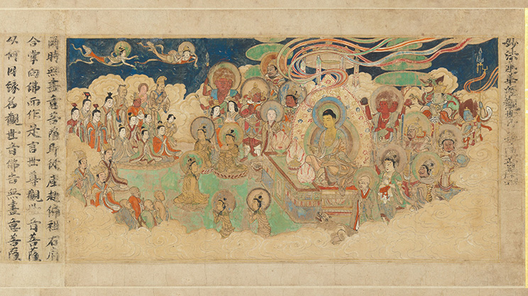 —Asamblea de monjes, seglares, deidades y protectores del Dharma escuchan la promulgación del capítulo XXV del Sutra del loto del Dharma verdadero “La puerta universal del bodhisattva Avalokiteshvara”, por Sugawara Mitsushige, 1257, período Kamakura (Japón), tinta, colores y oro sobre pergamino. Foto de Metropolitan Museum of Art, New York (EE. UU.), Open Access / CC0 1.0 UNIVERSAL, via Wikimedia Commons—