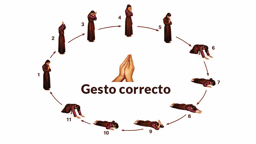 En la postración completa, la forma más radical de entrega física, el cuerpo entero se extiende en el suelo, con los brazos hacia delante, tocando cinco puntos: la frente, las dos palmas y las dos rodillas.