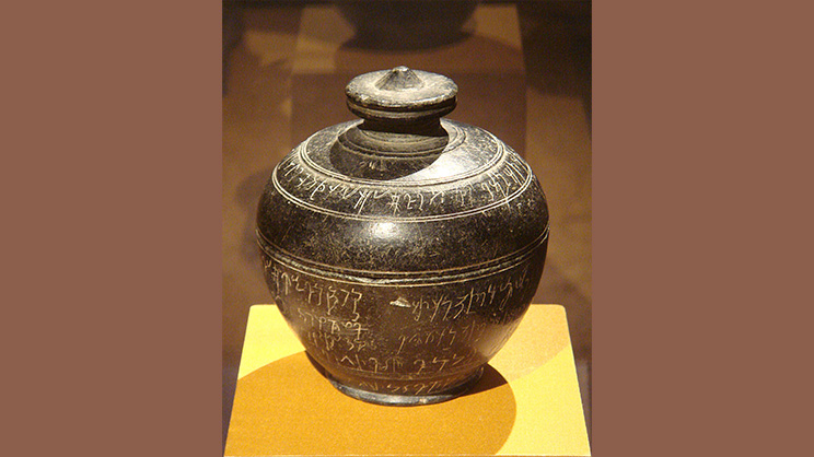 ―Urna con reliquias del Buddha Shakyamuni de Bajaur con inscripción en escritura kharoshthi, también denominado como relicario de Indravarma, proveniente del área de Bajaur en la antigua Gandhara, actual distrito de Khyber Pakhtunkhwa (Pakistán), ss. V-VI e. c., esquisto. Imagen de PHGCOM, CC BY-SA 3.0, via Wikimedia Commons―