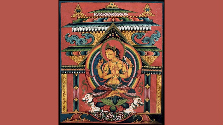 ―Deidad Prajñaparamita amarilla con cuatro brazos, Tíbet Occidental, estilo indio de Cachemira, ss. XIII-XIV e. c., tinta sobre papel, colección particular. Unknown Author, Public domain, via Wikimedia Commons—