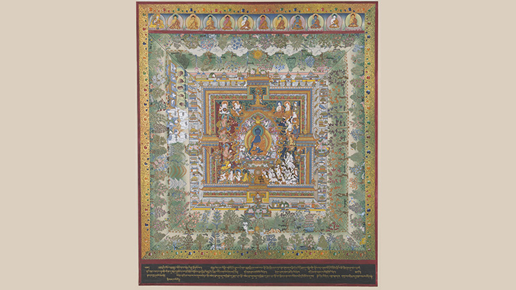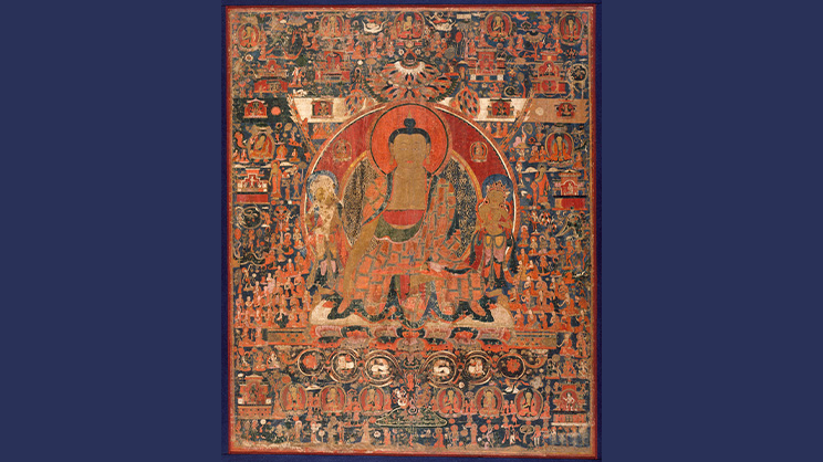 —El Buddha Aksobhya presidiendo su tierra del “Deleite supremo” (Abhirati), reino de Gugé (Tíbet Occidental), s. XV e. c., pintura de pigmentos minerales y oro sobre lienzo de algodón. Imagen de Boston Museum of Fine Arts (EE.UU.), Public domain, via Wikimedia Commons—