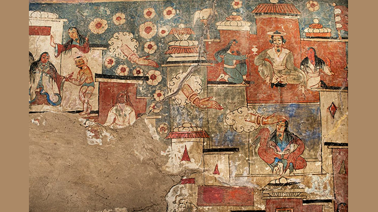 —Episodio del Gandavyuha Sutra donde el bodhisattva Mañyushri hace descender su mano con la que bendice al peregrino Sudhana (abajo dcha.). Monasterio de Tabo, Valle de Spiti, Himachal Pradesh (India), c. 1047 e. c., pintura mural. Imagen de Escriba tibetano del siglo XI. Fotógrafo: L. Fieni, Public domain, via Wikimedia Commons—
