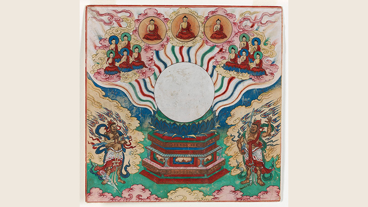 ―El Buddha Vairochana Omnisciente (Sarvavidya) en su aspecto de realidad última en forma de disco de luna sobre un loto azul sostenido por un trono. Del disco irradian rayos de luz arcoíris, en la parte superior se hallan los buddhas de los tres tiempos y las diez direcciones y en ambos flancos se ubican dos Protectores del Dharma (Dharmapala). Lámina del álbum “La guía secreta del Buddha Omnisciente” encargada por un noble mongol de la dinastía Qing, China, s. XVIII e. c., Imagen de Museum aan de Stroom Collection, DAMS Antwerpen (Bélgica). 18th century Chinese painter, Public domain, via Wikimedia Commons―