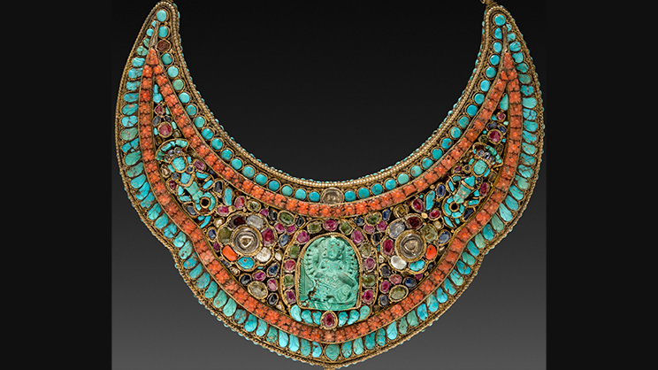 —Gola de plata con incrustaciones de turquesas, perlas, corales, rubíes, zafiros azules, diamantes y esmeraldas, Tíbet, s. XVIII e. c., Cleveland Museum of Art (EE.UU.). Imagen de Cleveland Museum of Art, CC0, via Wikimedia Commons—
