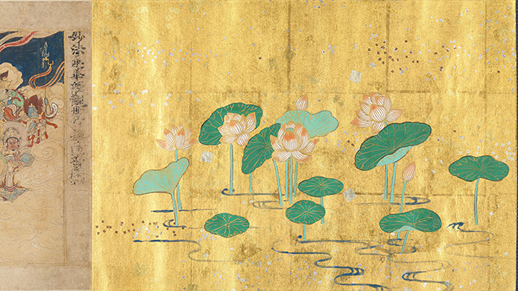 —Lotos blancos que surgen de aguas cenagosas con fondo de luz dorada; imagen que precede el capítulo XXV del Sutra del loto del Dharma verdadero “La puerta universal del bodhisattva Avalokiteshvara”, por Sugawara Mitsushige, período Kamakura (Japón), 1257, tinta, colores y oro sobre pergamino. Imagen de Metropolitan Museum of Art, New York (EE. UU.). Public domain, via Wikimedia Commons—