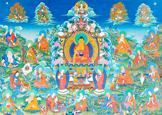 Justo antes de pasar al paranirvana, el Buddha solicitó a sus principales dieciséis discípulos que permanecieran con nosotros para guiarnos y proteger las actividades del Dharma. Ellos habían alcanzado el estado de arjat ―el primer nivel de la iluminación―, pero esto no fue disuasivo, sino que, como una expresión de su gran compasión, asumieron este compromiso trascendental.