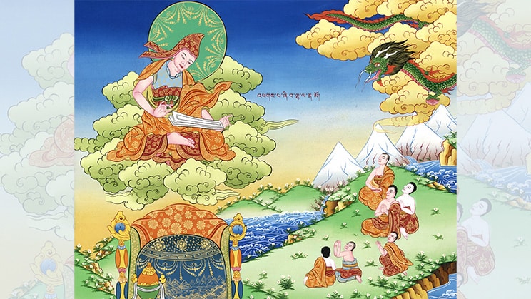 Thangka tibetana que representa el milagro de Shantideva en Nalanda. El maestro levita sobre nubes verdes recitando el noveno capítulo del Bodhicharyavatara mientras los monjes observan asombrados. El dragón verde simboliza el poder de sus enseñanzas. En la inscripción tibetana se lee: “Homenaje al noble Shantideva”. Fuente: Khyentse Lineage: A Tsadra Foundation Project.