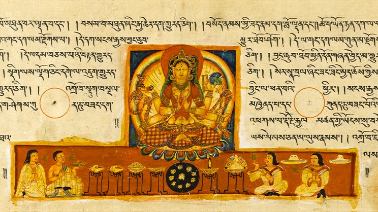 La Prajñaparamita con devotos. Folio de un manuscrito del Sutra de la perfección de la sabiduría en cien mil líneas (Shatasahasrika-prajñaparamita Sutra), proveniente del monasterio de Tholing, distrito Maryul, Tíbet Occidental, s. XI e. c., tinta, acuarela opaca y oro sobre papel. Los Angeles County Museum of Art, Public domain, via Wikimedia Commons.